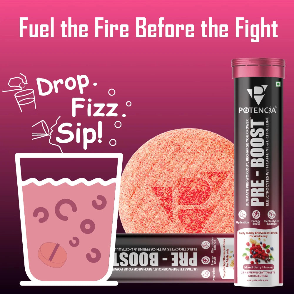 Pack of 3 Potencia PRE-BOOST | Mixed Berry | Pre-Workout Effervescent Tablets | Energy + Hydration + Pump | With Citrulline, Taurine, Caffeine & Beta-Alanine | 45 Tabs/Bottle