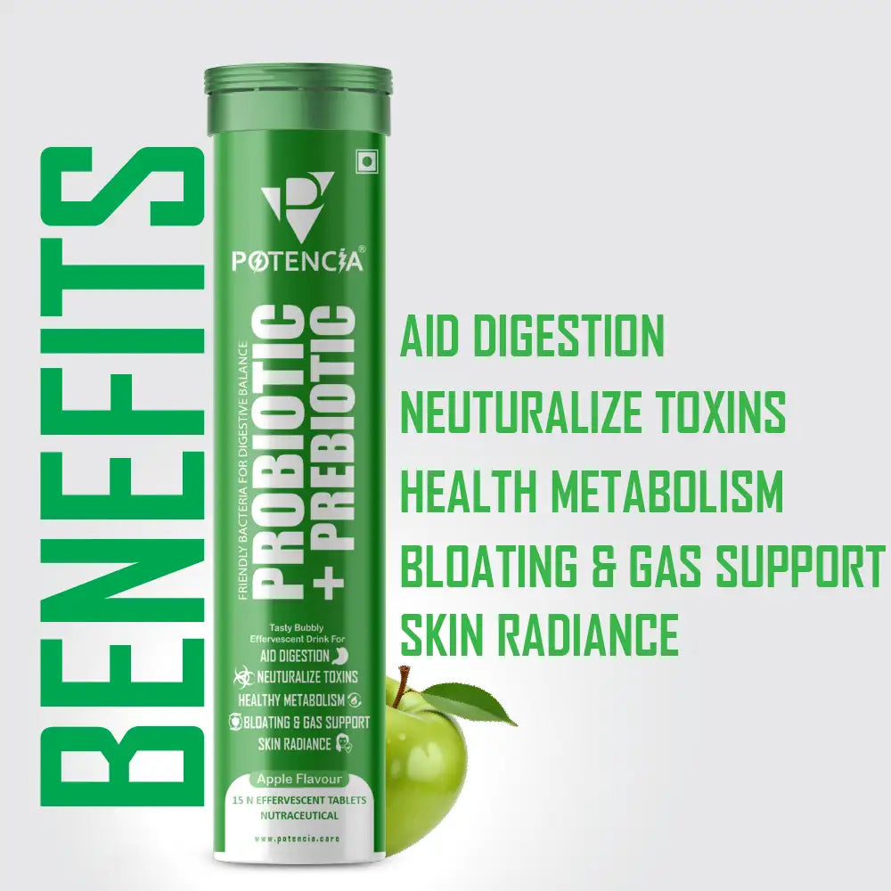 Potencia Probiotic + Prebiotic Fizzy Tablets promote gut health, digestion, and immunity with a delicious apple-flavored fizzy drink. Packed with probiotics and prebiotics, they ease bloating, enhance nutrient absorption, and support mental wellness. The fast-absorbing formula is more effective than capsules and free from sugar, gluten, and artificial preservatives. Ideal for those with digestive issues, low immunity, or busy lifestyles, it’s your daily gut health booster. Drop, fizz, and sip your way to a healthier gut!